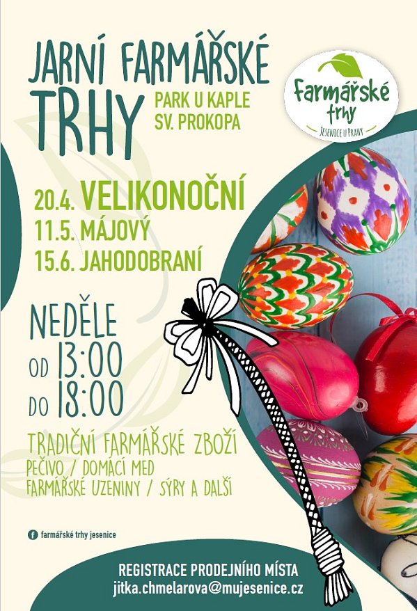 Už v neděli zveme na Velikonoční trh s programem! Od 13 hodin v parku u kaple sv. Prokopa nakoupíte uzené přímo od řezníka, sýry, tradiční pečivo staročeských receptur, kvasové chleby, pečivo, mazance, makronky, farmářské produkty, slané karamely, francouzské produkty, jarní dekorace, kraslice, korálky, mandaly, sušené maso a skvělé občerstvení. Nebude chybět výborná káva - novinka „Barevná energie v každém doušku – Matcha Pistachio, Blue Chai, Pink Chai Latte!“Nebude chybět ani káva alá Dubaj , holandské lívanečky a výborné burgery. Pro děti jsou připraveny workshopy do 17 hodin - kraslice, jarní věneček, malování na perníčky, pro tatínky také pletení pomlázek. Trh navštíví ovečky a kozlík a také animatorky, které od 15:30 pobaví hlavně děti soutěžně tanečním programem.